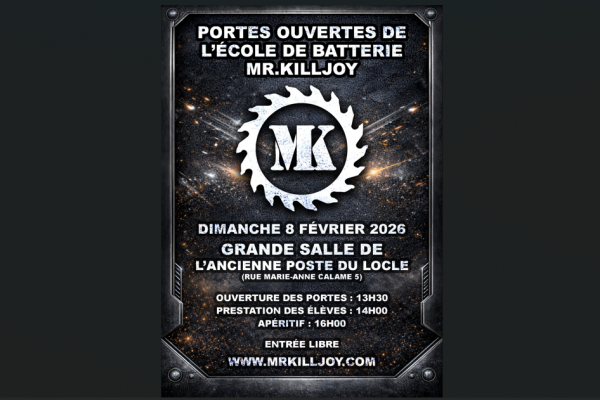 Dimanche 8 février 2026 Mr Killjoy organise les portes ouvertes de son école de batterieVenez nombreux !